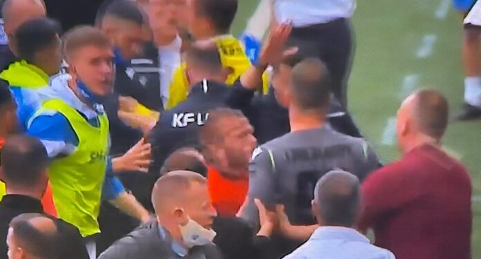 Kur po zhvillohet minuta e 35’të e takimit, në fushë ndodhi një përleshje, shkruan Insporti.