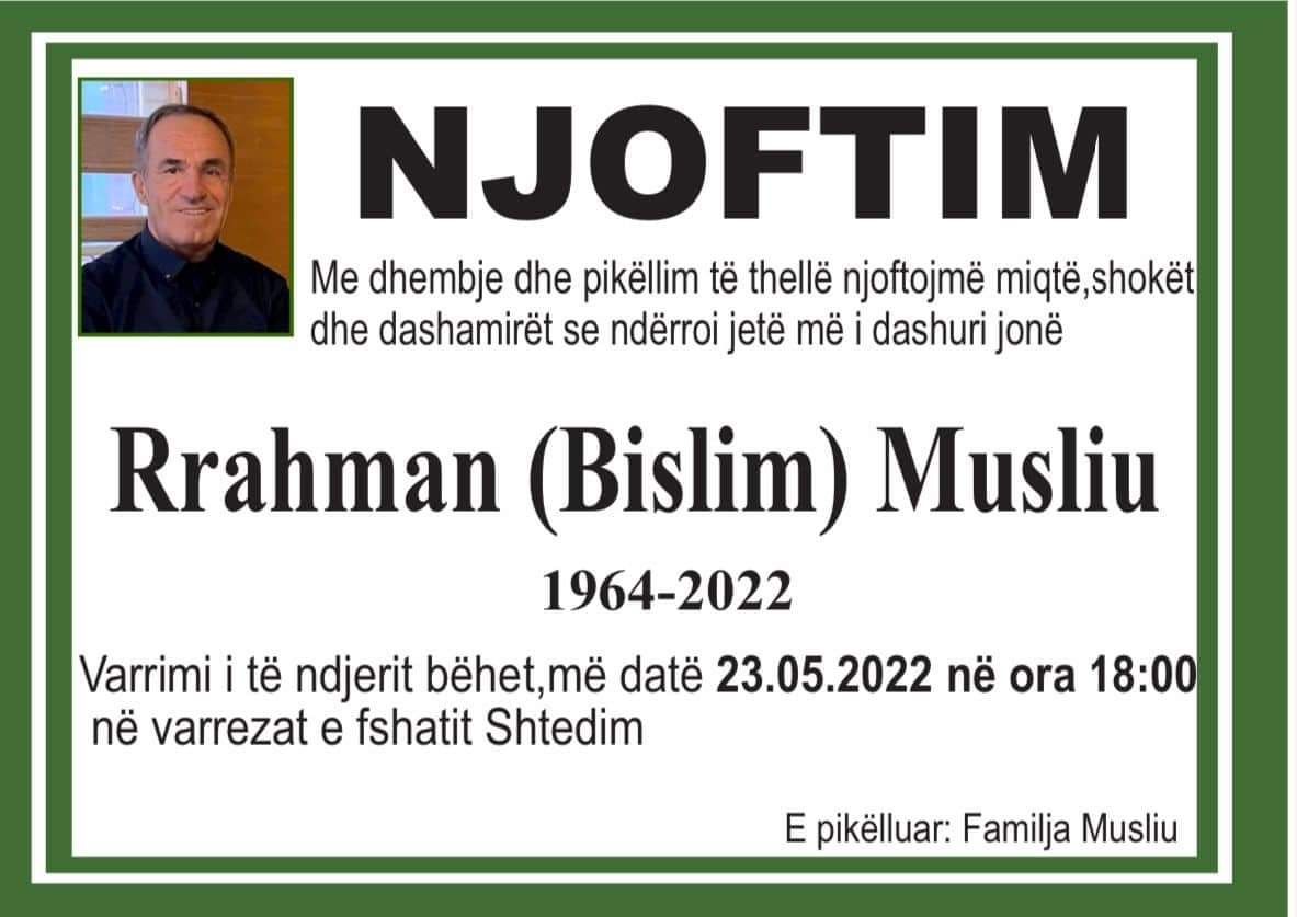 Familja Musliu nga Podujeva, ka njoftuar se ka vdekur familjari i tyre, Rrahman Musliu.