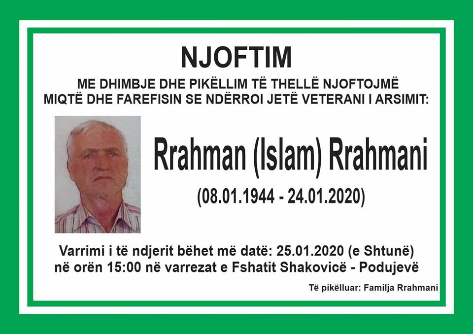 Ka ndërruar jetë veterani i arsimit në Komunën e Podujevës, Rrahman Rrahmani, njofton Llapi.info.