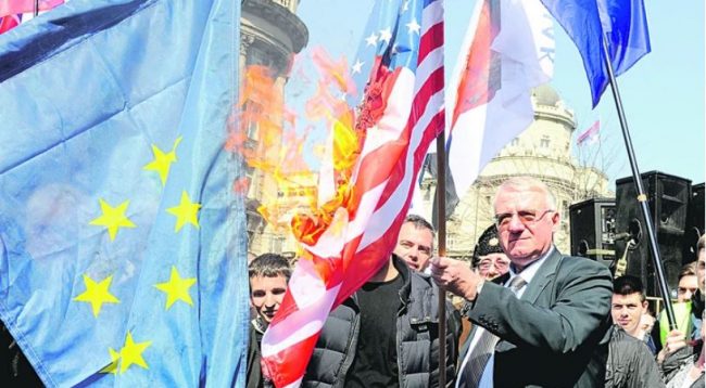 Në 20-vjetorin e fillimit të bombardimeve të NATO-s, udhëheqësi i Partisë Radikale Serbe, Vojisllav Sheshel, i ka vënë flakën flamuri të Bashkimit Evropian dhe të NATO-s, transmeton lajmi.net.