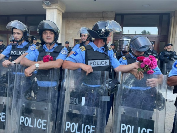 Në përfundim të protestës, veteranët të cilët protestuan sot para ndërtesës së Kuvendit u kanë shpërndarë lule pjesëtarëve të Policisë së Kosovës.