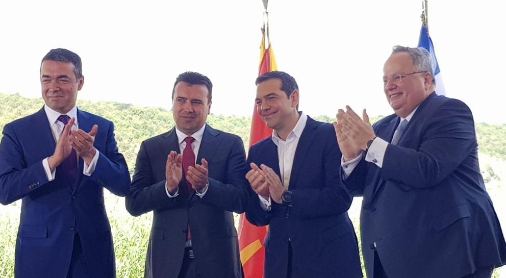 Alexis Tsipras i Greqisë dhe Zoran Zaev i Maqedonisë ishin dëshmitarë të nënshkrimit të marrëveshjes nga ministrat e Jashtëm të të dyja vendeve, raporton Reuters.