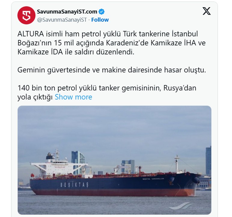 Anija turke e naftës Altura u godit nga një dron rreth 15 milje detare (28 km) larg Ngushticës së Bosforit në Stamboll, raportoi të enjten televizioni NTV, duke shtuar se të 27 anëtarët e ekuipazhit ishin të sigurt.