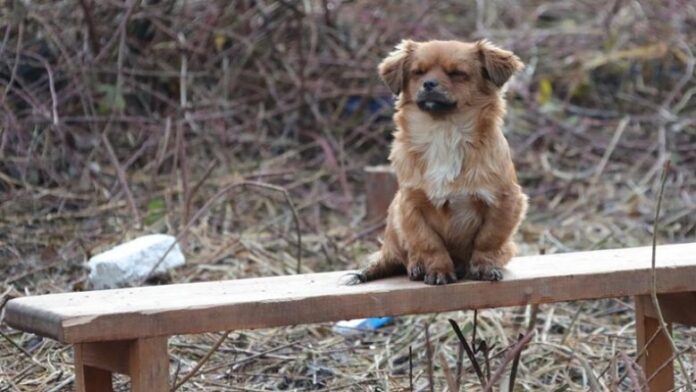 Një qenush i trishtuar u vendos në një stol pranë një grumbulli tullash që dikur kishin qenë shtëpia e dikujt, ndërsa një fanar po digjej aty pranë.
