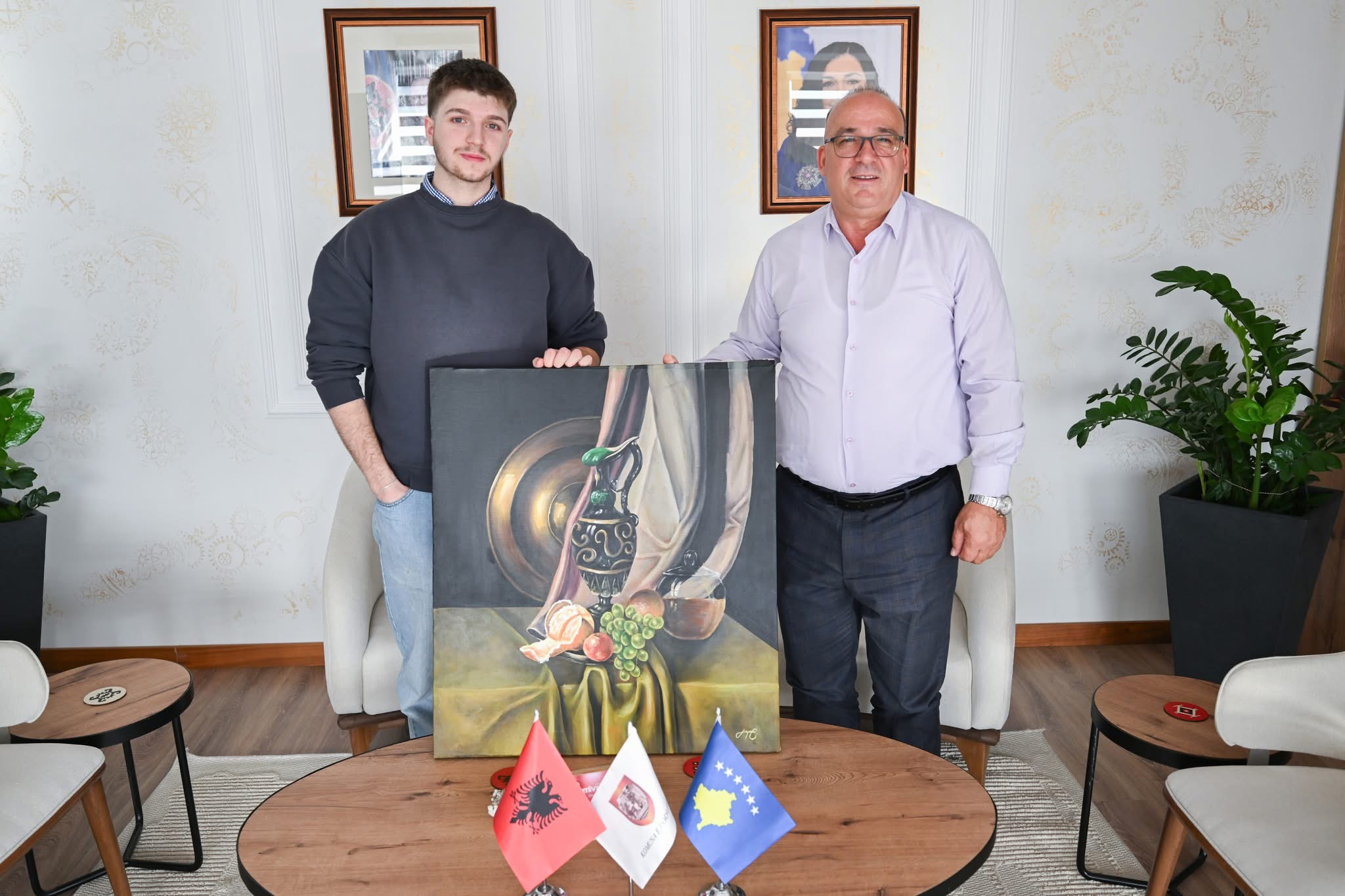Gjatë takimit, studenti Gashi i dhuroi kryetarit një pikturë me motiv “natyrë e qetë”, të realizuar në pëlhurë, si shenjë respekti dhe mirënjohjeje.
