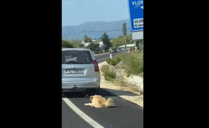 Në videon e publikuar nga Sazan Guri, shihet se një person me veturë tërheq zvarrë një qen, raporton Zeri.info.