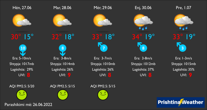Kryesisht me diell e temperatura maksimale edhe deri në 35C, parashikon “Prishtina Weather”.
