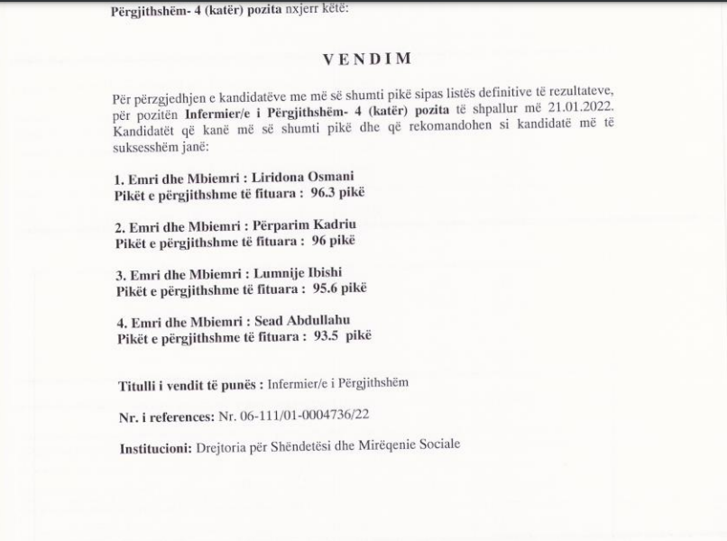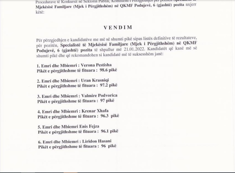 Komuna e Podujevës, në janar të këtij viti, kishte hapur konkursin për pranimin e gjashtë mjekëve të përgjithshëm dhe katër infermierëve në Qendrën Kryesore të Mjekësisë Familjare, raporton Llapi.info.