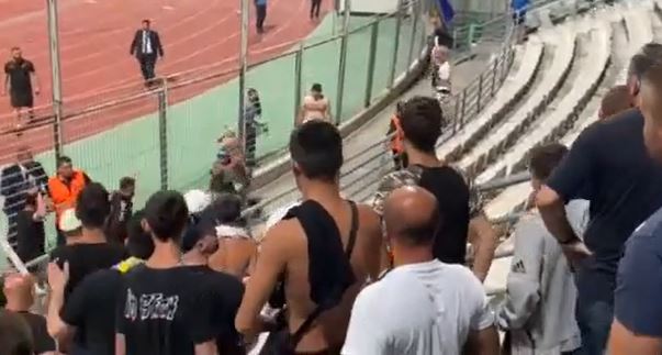 Pas mbylljes së pjesës së parë, nga një video shihet një përleshje mes tifozëve, teksa ndërhyn Policia për ta ndalur incidentin.