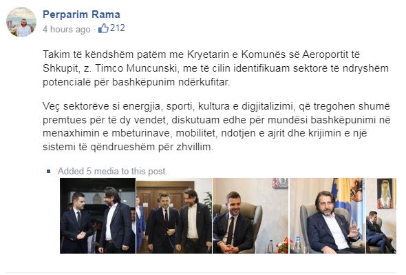 Kryetari i Prishtinës, Përparim Rama, këtë të mërkure, është takuar me kryetarin e komunës “Aerodrom” të Shkupit, Timco Muncunski.