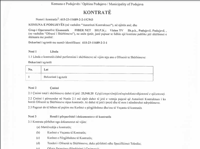 Në kontratë është bërë e ditur se operatori që ka fituar tenderin është “Fiber net” me seli në Podujevë.