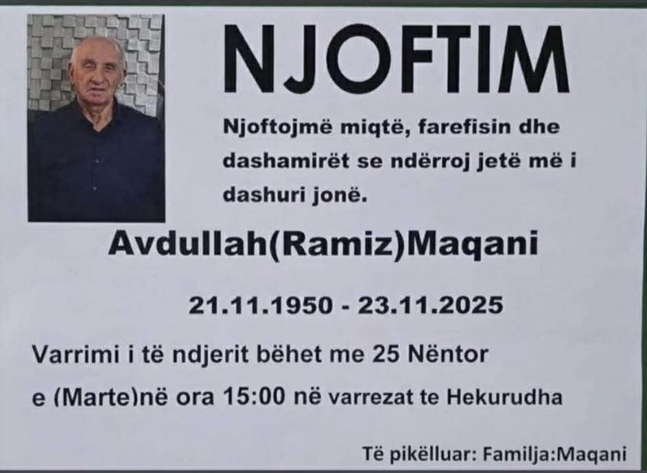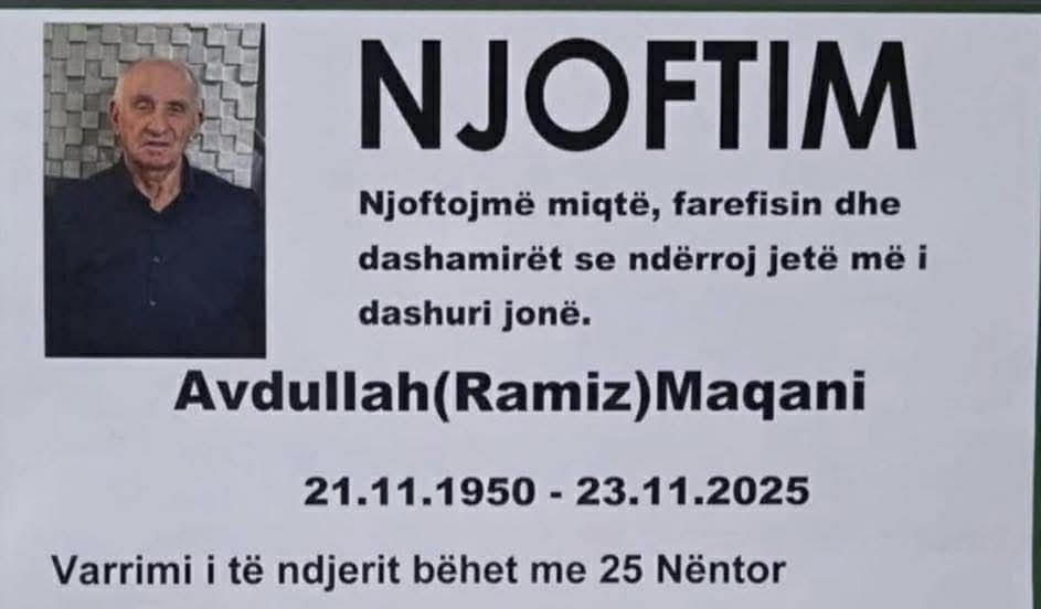 Ballina Lajmet Podujevë; Ndërron jetë Avdullah Maqani (Foto) Podujevë; Ndërron jetë Avdullah Maqani (Foto) 25/11/2025 Share FacebookTwitterWhatsAppViberEmail Ka ndërruar jetë Avdullah Maqani nga Podujeva. Varrimi i tij bëhet sot në ora 15:00, në varrezat te Hekurudha. Lajmi u bë i ditur nga familjarët e të ndjerit. ARTIKUJ TË NGJASHËMMË SHUMË NGA AUTORI Lajmet Arrestohet një grua në Podujevë, ushtroi dhunë psikike ndaj partnerit Lajmet Këta janë të dyshuarit për tentim vrasjen në Vranjevc Lajmet Ky është i dënuari që i dha fund jetës në Burgun e Sigurisë së Lartë në Gërdoc (EMRI)
