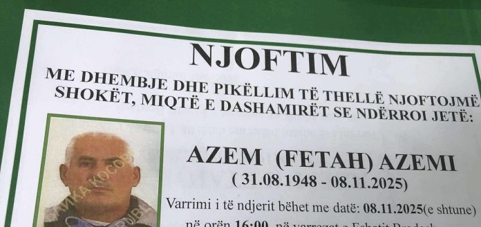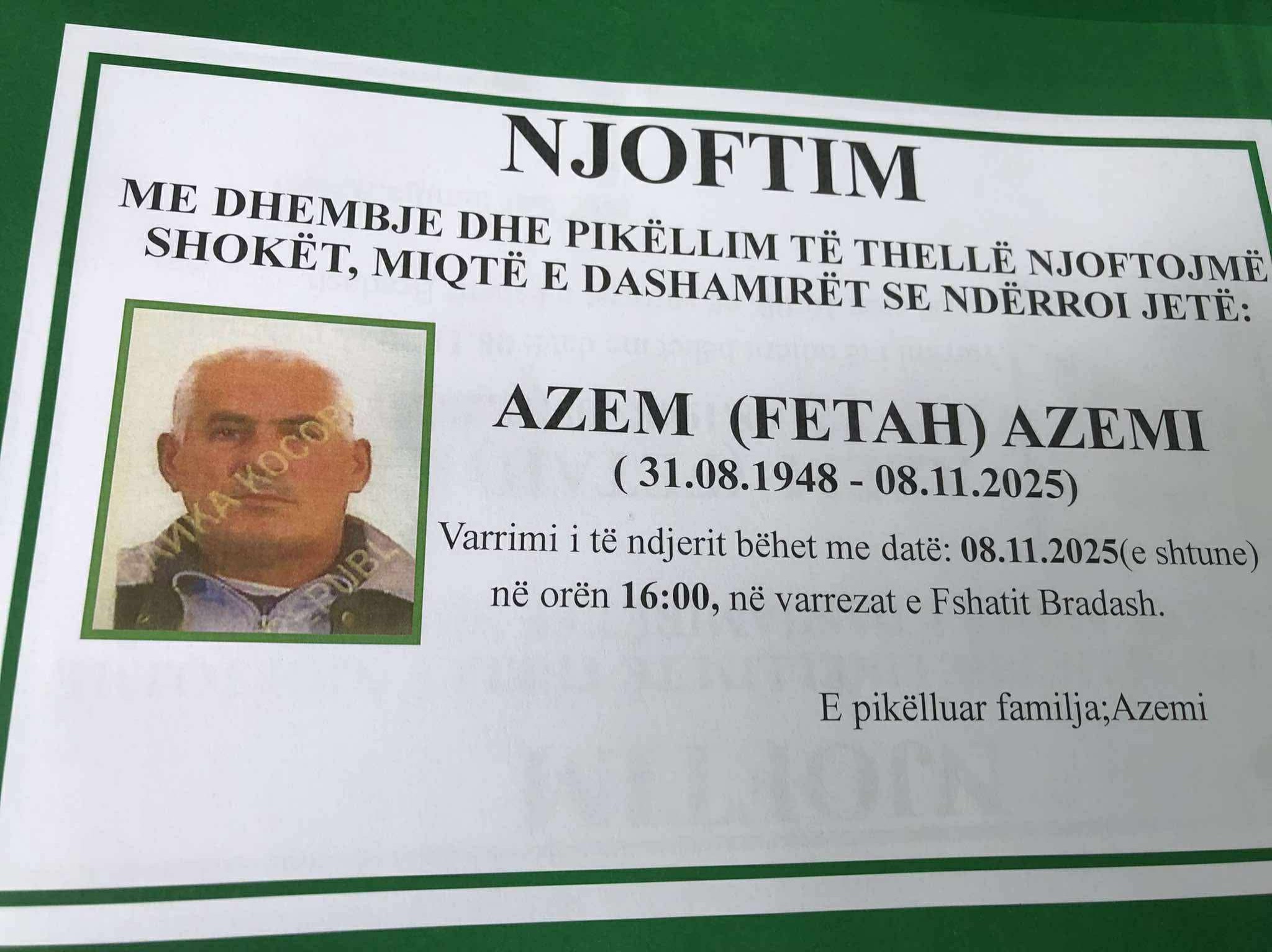Ballina Lajmet Podujevë; Ndërron jetë Azem Azemi (Foto) Podujevë; Ndërron jetë Azem Azemi (Foto) 08/11/2025 Share FacebookTwitterWhatsAppViberEmail Ka ndërruar jetë Azem Azemi nga Podujeva. Varrimi i tij bëhet sot në ora 16:00 në varrezat e fshatit Bradash. Lajmi u bë i ditur nga familjarët e të ndjerit. ARTIKUJ TË NGJASHËMMË SHUMË NGA AUTORI Lajmet Nait Hasani i kërkon Bedri Hamzës ta pranoj shkrirjen e Fatmir Limajt në PDK: Bashkimi bën fuqi Lajmet Një person dhunon të miturën, e incizon dhe e publikon videon Lajmet Ky është personi që humbi jetën në QKUK, ishte i dyshuar për vrasje