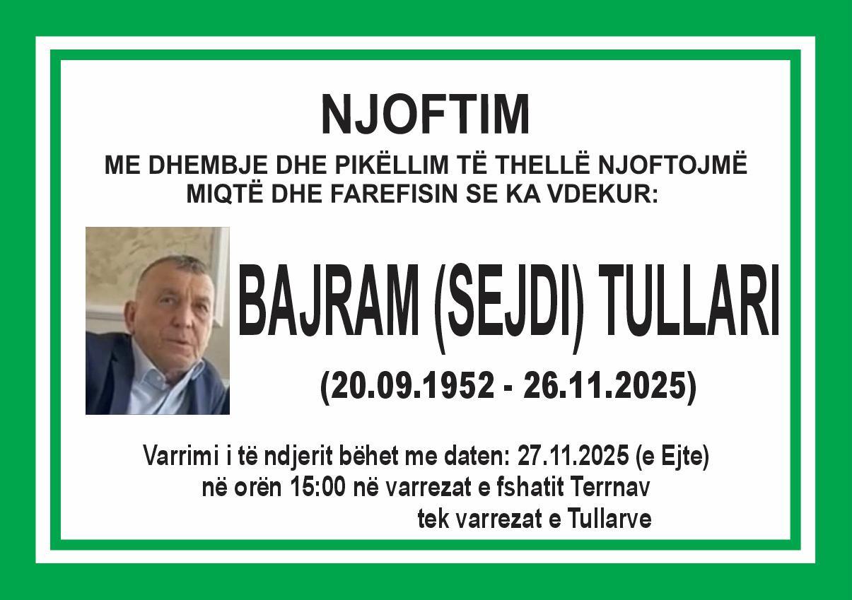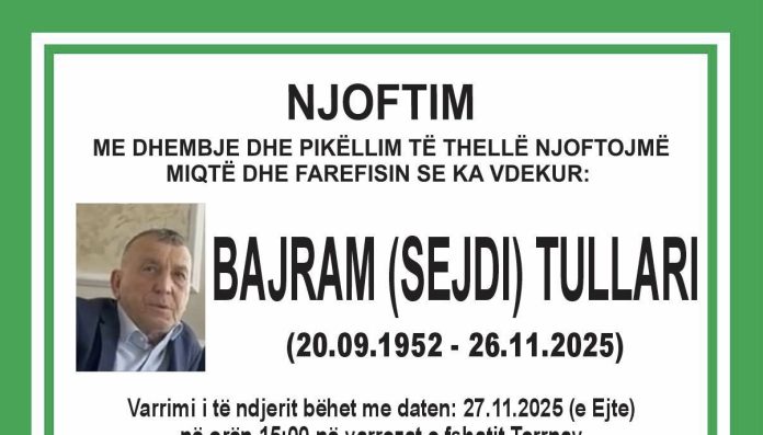 Ballina Lajmet Podujevë; Ndërron jetë Bajram Tullari (Foto) Podujevë; Ndërron jetë Bajram Tullari (Foto) 26/11/2025 Share FacebookTwitterWhatsAppViberEmail Ka ndërruar jetë Bajram Tullari nga Podujeva. Varrimi i tij bëhet nesër (e enjte) në ora 15:00, në varrezat e fshatit Tërrnavë. Lajmi u bë i ditur nga familjarët e të ndjerit. ARTIKUJ TË NGJASHËMMË SHUMË NGA AUTORI Lajmet Ermal Sadiku aderon në LDK Lajmet Mjeku që trajtoi babain e Hashim Thaçit, aderon në PDK Lajmet A do të aderojë Visar Ymeri në LDK? Ermal Panduri jep lajmin e fundit