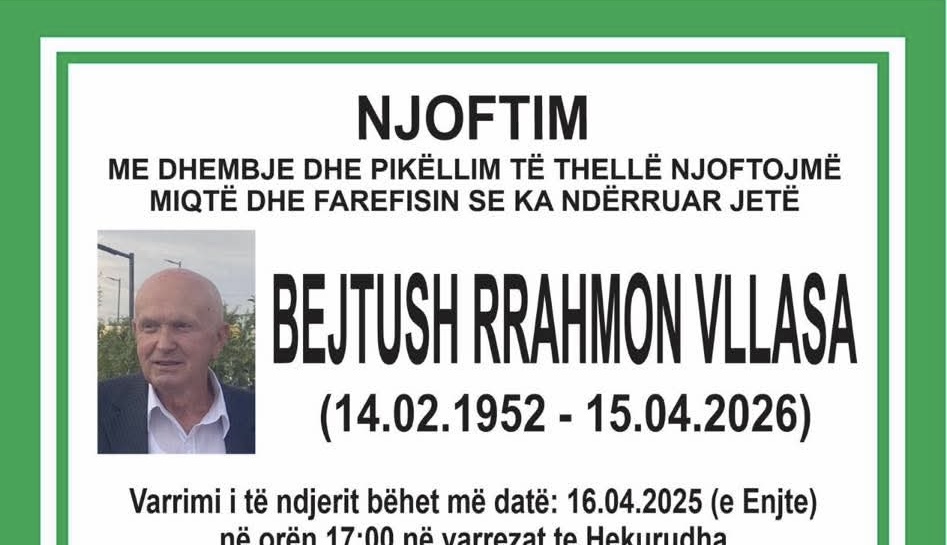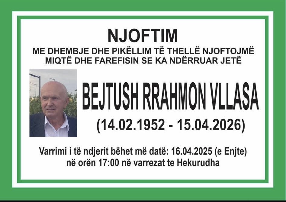 Ballina Lajmet Podujevë; Ndërron jetë Bejtush Vllasa (Foto) Podujevë; Ndërron jetë Bejtush Vllasa (Foto) 16/04/2026 Share FacebookTwitterWhatsAppViberEmail Ka ndërruar jetë Bejtush Vllasa nga Podujeva. Varrimi i tij bëhet sot në ora 17:00, në varrezat te Hekurudha. Lajmi u bë i ditur nga familjarët e të ndjerit. ARTIKUJ TË NGJASHËMMË SHUMË NGA AUTORI Lajmet Podujevë; Ndërron jetë Avni Kosumi (Foto) Lajmet Këto janë çmimet e derivateve për sot Lajmet Plagosen dy persona, Policia jep detaje