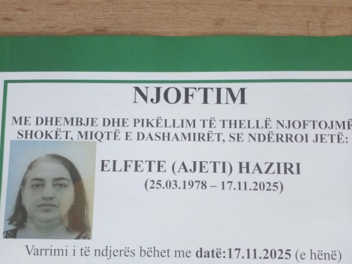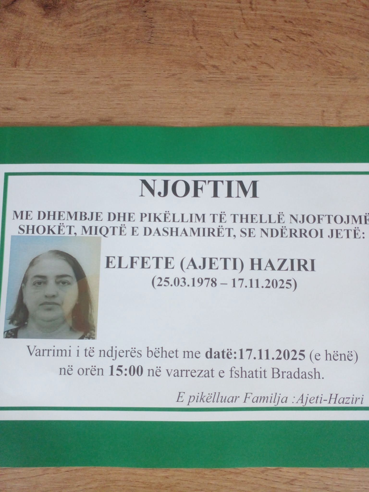 Ballina Lajmet Podujevë: Ndërron jetë Elfete Ajeti – Haziri (Foto) Podujevë: Ndërron jetë Elfete Ajeti – Haziri (Foto) 17/11/2025 Share FacebookTwitterWhatsAppViberEmail Ka ndërruar jetë Elfete Ajeti – Haziri nga Podujeva. Varrimi i saj bëhet sot në ora 15:00 në varrezat e fshatit Bradash. Lajmi u bë i ditur nga familjarët e të ndjerës. ARTIKUJ TË NGJASHËMMË SHUMË NGA AUTORI Lajmet Këta janë ministrat e prezantuar nga Glauk Konjufca Lajmet Dy seancat e sotme, Limaj i quan lojë të pushtetit dhe tendencë për t’i fajësuar të tjerët Lajmet Befason Isa Mustafa: Ramush Haradinajt duhet të ja di për nder krejt Kosova