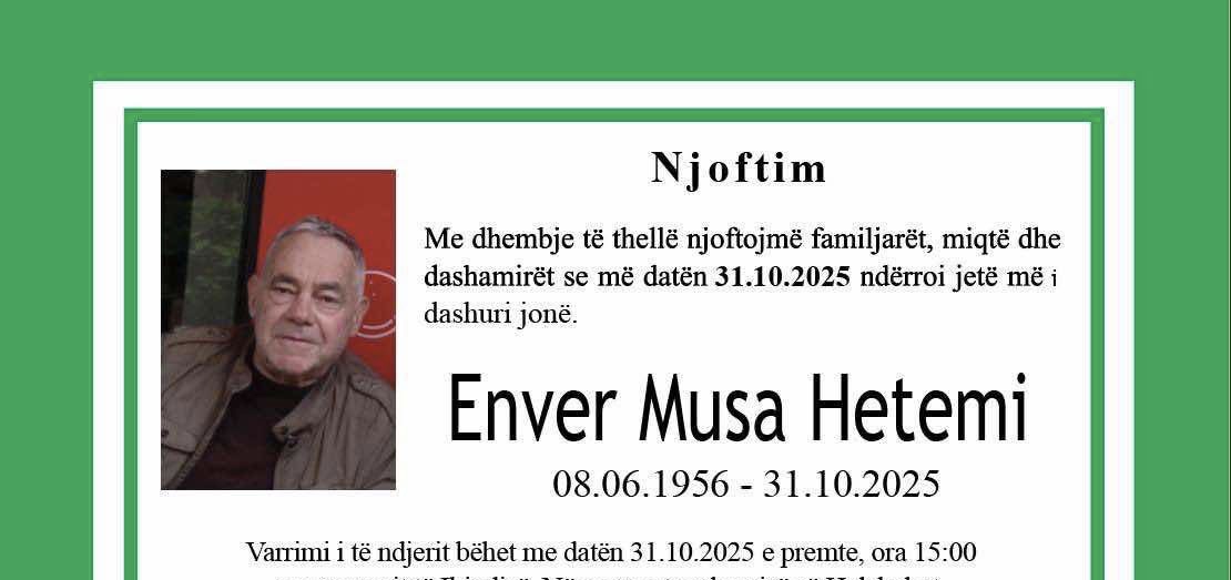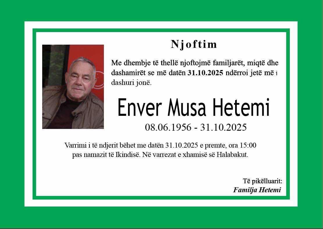 Ballina Lajmet Podujevë; Ndërron jetë Enver Hetemi (Foto) Podujevë; Ndërron jetë Enver Hetemi (Foto) 31/10/2025 Share FacebookTwitterWhatsAppViberEmail Ka ndërruar jetë Enver Hetemi nga Podujeva. Varrimi i tij bëhet sot në ora 15:00 në varrezat e fshatit Halabak. Lajmi u bë i ditur nga familjarët. ARTIKUJ TË NGJASHËMMË SHUMË NGA AUTORI Lajmet Krasniqi: Nga zgjedhjet e reja do ta krijojmë qeverinë e re pa Albin Kurtin dhe Vetëvendosjen Lajmet Lajm shumë i mirë; Nënshkruhet kontrata për ndërtimin e rrugës Sylevicë dhe Tërnavicë (Dokument) Lajmet Treni godet veturën në Fushë Kosovë (Video)