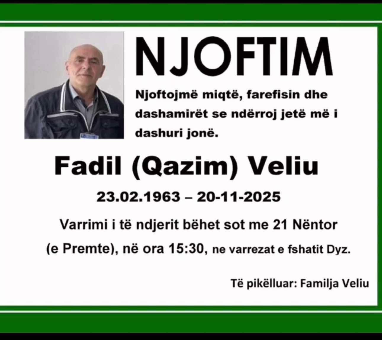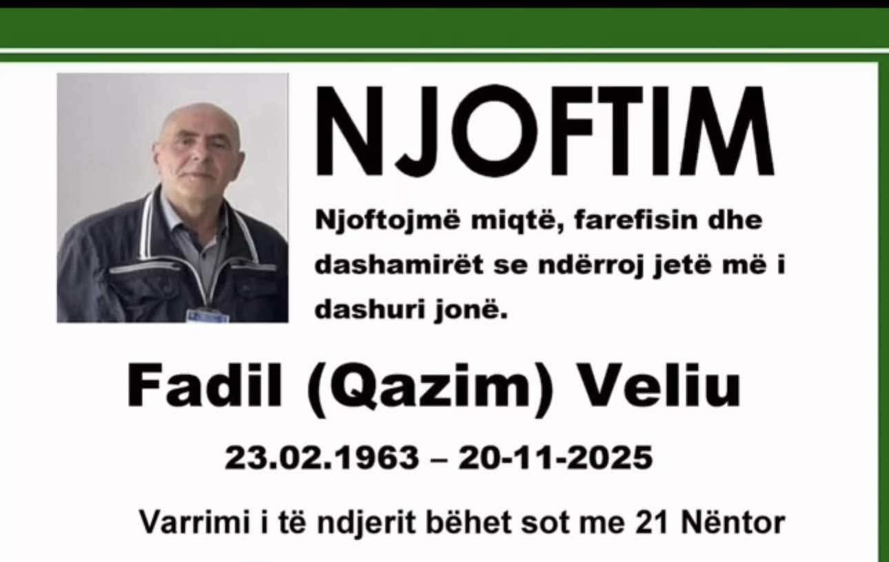 Ballina Lajmet Podujevë; Ndërron jetë Fadil Veliu (Foto) Podujevë; Ndërron jetë Fadil Veliu (Foto) 21/11/2025 Share FacebookTwitterWhatsAppViberEmail Ka ndërruar jetë Fadil Veliu nga Podujeva. Varrimi i tij bëhet sot në ora 15:30, në varrezat e fshatit Dyz. Lajmi u bë i ditur nga familjarët e të ndjerit. ARTIKUJ TË NGJASHËMMË SHUMË NGA AUTORI Lajmet Podujevë; Ndërron jetë Shpresë Bulliqi – Fetahu (Foto) Lajmet Pamje të rënda nga vetaksidenti ku pati të vdekur (Video) Lajmet Gjuajtje me armë në këtë fshat