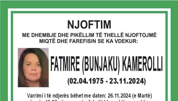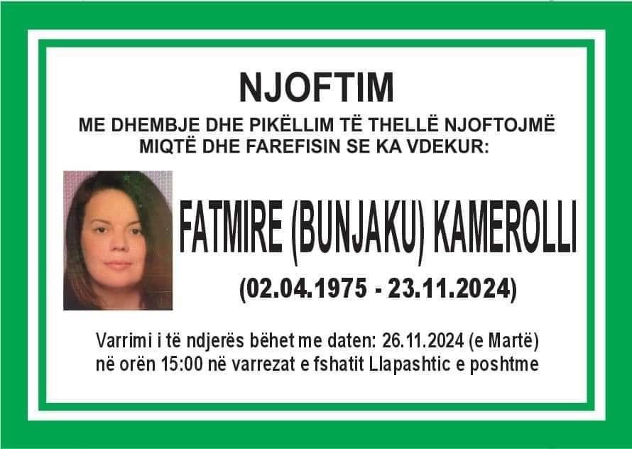Ballina Lajmet Podujevë; Ndërron jetë Fatmire Bunjaku – Kamerolli (Foto) Podujevë; Ndërron jetë Fatmire Bunjaku – Kamerolli (Foto) 25/11/2024 Share FacebookTwitterWhatsAppViberEmail Ka ndërruar jetë Fatmire Bunjaku – Kamerolli nga Podujeva. Varrimi i saj do të bëhet nesër në ora 15:00 në varrezat e fshatit Llapashticë e Poshtme. Lajmi u bë i ditur nga familjarët e të ndjerës. ARTIKUJ TË NGJASHËMMË SHUMË NGA AUTORI Lajmet LAJMI I FUNDIT: “Zagar, qyrr”, Olluri e Kraki ngriten në këmbë për t’u përleshur fizikisht Lajmet Mbyllet për katër ditë rruga Kërpimeh – Bajgorë Lajmet Shumë e dhimbshme; Ndërron jetë i riu nga Podujeva (Foto)