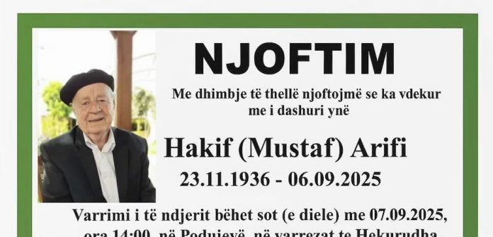 Ballina Lajmet Podujevë; Ndërron jetë Hakif Arifi (Foto) Podujevë; Ndërron jetë Hakif Arifi (Foto) 07/09/2025 Share FacebookTwitterWhatsAppViberEmail Ka ndërruar jetë Hakif Arifi nga Podujeva. Varrimi i tij bëhet sot në ora 14:00, në varrezat te Hekurudha. Lajmi u bë i ditur nga familjarët. ARTIKUJ TË NGJASHËMMË SHUMË NGA AUTORI Lajmet Katër shoferë dënohen me mbi 1 mijë euro gjobë Lajmet Tjetër aksident në Podujevë (Pamje) Lajmet Aksident i rëndë mes veturës dhe traktorit në Podujevë (Video)