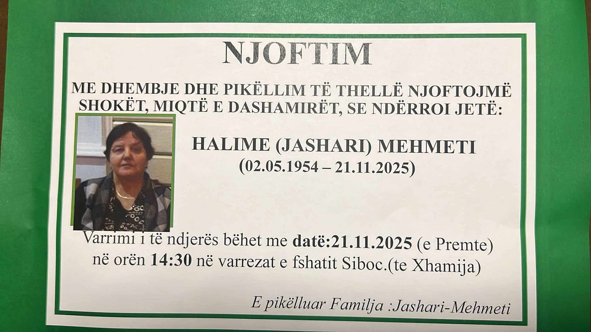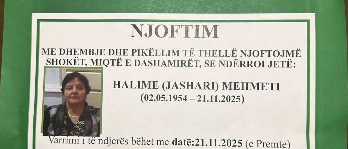Ballina Lajmet Podujevë; Ndërron jetë Halime Mehmeti (Foto) Podujevë; Ndërron jetë Halime Mehmeti (Foto) 21/11/2025 Share FacebookTwitterWhatsAppViberEmail Ka ndërruar jetë Halime Mehmeti nga Podujeva. Varrimi i saj bëhet sot në ora 14:30, në varrezat e fshatit Siboc. Lajmi u bë i ditur nga familjarët e të ndjerës. ARTIKUJ TË NGJASHËMMË SHUMË NGA AUTORI Lajmet Sot këngëtarja e njohur i bashkohet LDK’së Lajmet Podujevë; Ndërron jetë Sabri Rrahmani (Foto) Lajmet Podujevë; Ndërron jetë Mihane Hoxha – Gashi (Foto)