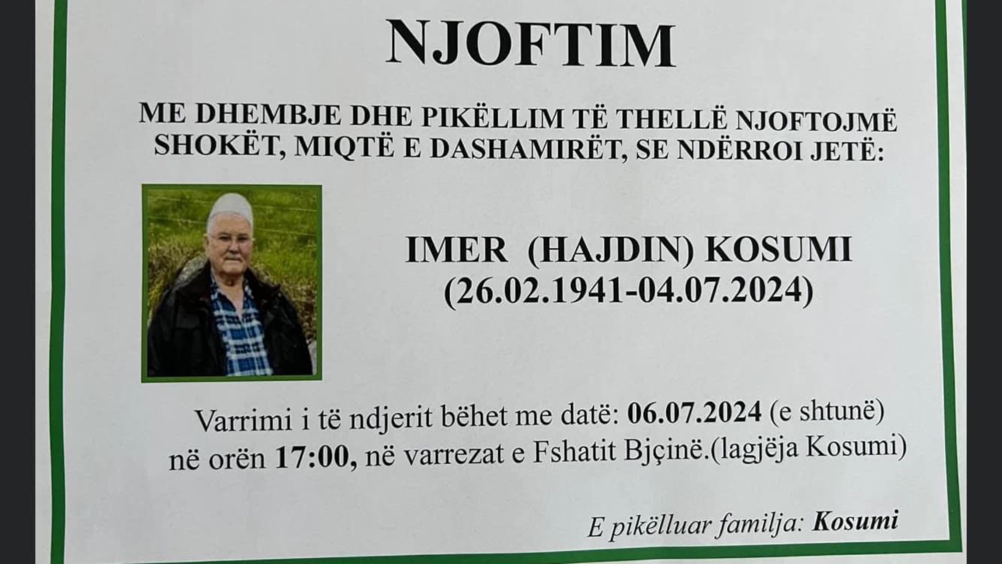 Ballina Lajmet Podujevë; Ndërron jetë Imer Kosumi (Foto) Podujevë; Ndërron jetë Imer Kosumi (Foto) 06/07/2024 Share FacebookTwitterWhatsAppViberEmail Ka ndërruar jetë Imer Kosumi nga Podujeva, shkruan Llapi.info. Varrimi i tij do të bëhet sot në ora 17:00 në varrezat e fshatit Bajçinë (Lagjja e Kosumëve). Lajmi u bë i ditur nga familjarët e të ndjerit. /Llapi.info/ ARTIKUJ TË NGJASHËMMË SHUMË NGA AUTORI Lajmet Gruaja që u gjet e vdekur në lumin Bistrica ishte shtatzënë Lajmet Lista zgjedhore e PDK-së nis me Hamzën e përfundon me Tahirin, kaq kandidatë do të jenë Lajmet Dhjetështja e parë e LDK’së për zgjedhjet e 28 dhjetorit