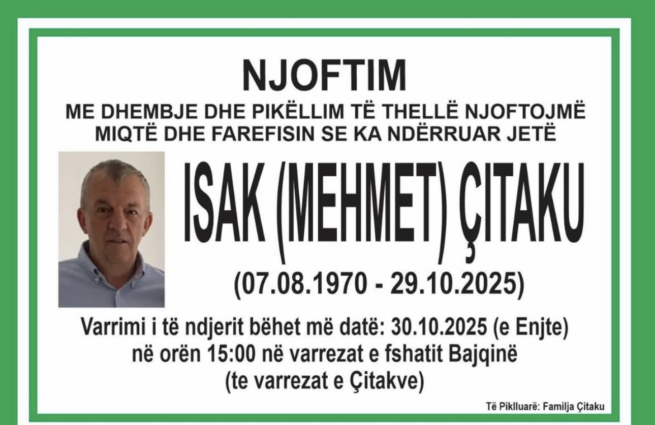 Ballina Lajmet Podujevë; Ndërron jetë Isak Çitaku (Foto) Podujevë; Ndërron jetë Isak Çitaku (Foto) 30/10/2025 Share FacebookTwitterWhatsAppViberEmail Ka ndërruar jetë Isak Çitaku nga Podujeva. Varrimi i bëhet sot në ora 15:00 në varrezat e fshatit Bajçinë. Lajmi u bë i ditur nga familjarët. Screenshot ARTIKUJ TË NGJASHËMMË SHUMË NGA AUTORI Lajmet Gruaja që u gjet e vdekur në lumin Bistrica ishte shtatzënë Lajmet Lista zgjedhore e PDK-së nis me Hamzën e përfundon me Tahirin, kaq kandidatë do të jenë Lajmet Dhjetështja e parë e LDK’së për zgjedhjet e 28 dhjetorit