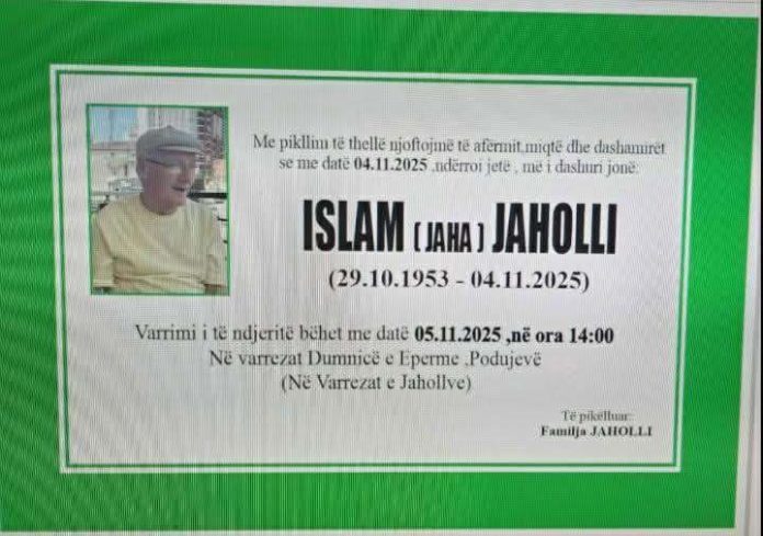 Ballina Lajmet Podujevë: Ndërron jetë Islam Jaholli (Foto) Podujevë: Ndërron jetë Islam Jaholli (Foto) 04/11/2025 Share FacebookTwitterWhatsAppViberEmail Ka ndërruar jetë Islam Jaholli nga Podujeva. Varrimi i tij bëhet nesër në ora 14:00, në varrezat e fshatit Dumnicë e Epërme. Lajmi u bë i ditur nga familjarët e të ndjerit. ARTIKUJ TË NGJASHËMMË SHUMË NGA AUTORI Lajmet Aksidenti me fatalitet, caktohet masa e paraburgimit për shoferin e veturës Lajmet Gazetari Sefer Demiri vendos ta shesë veturën e tij për ndërtimin e një shtëpie të të moshuarve Lajmet Presidentja Osmani mandaton Glauk Konjufcën për formimin e Qeverisë