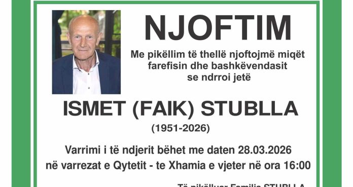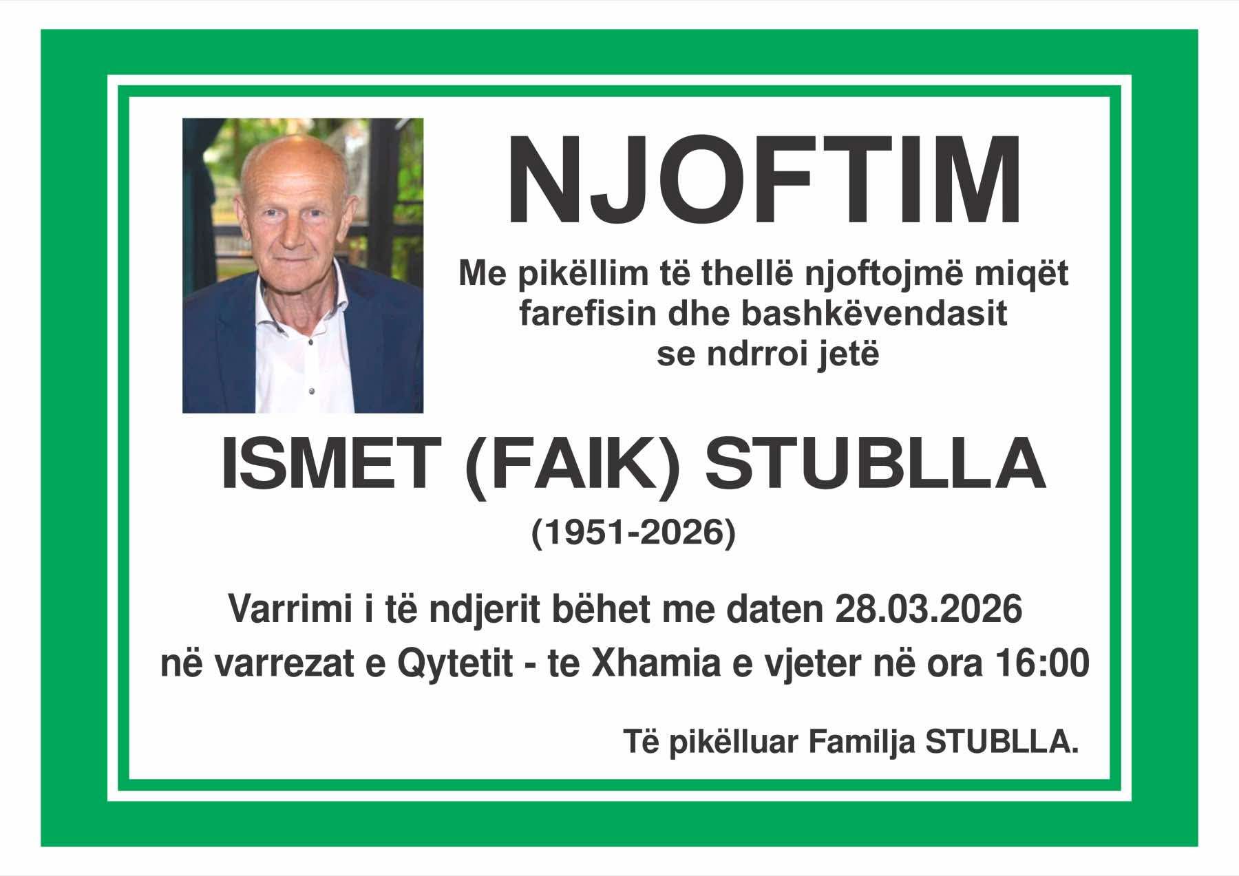 Ballina Lajmet Podujevë; Ndërron jetë Ismet Stublla (Foto) Podujevë; Ndërron jetë Ismet Stublla (Foto) 28/03/2026 Share FacebookTwitterWhatsAppViberEmail Ka ndërruar jetë Ismet Stublla nga Podujeva. Varrimi i tij bëhet sot në ora 16:00, në varrezat te Xhamia e Vjetër në Podujevë. Lajmi u bë i ditur nga familjarët e të ndjerit. ARTIKUJ TË NGJASHËMMË SHUMË NGA AUTORI Lajmet Vëllai sulmoi fizikisht motrën në Podujevë, dërgohet në mbajtje Lajmet Dorëzohet në polici i kërkuari për 500 kg drogë Lajmet Seria e vjedhjeve mbi 100 mijë euro në Fushë Kosovë – arrestohet i dyshuari, pranon veprat