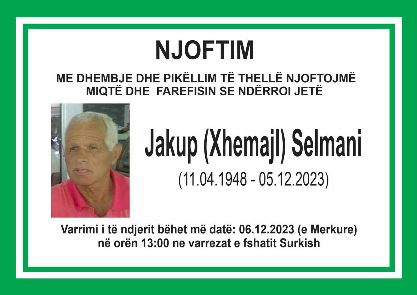 Ballina Lajmet Podujevë: Ndërron jetë Jakup Selmani Podujevë: Ndërron jetë Jakup Selmani 06/12/2023 Share FacebookTwitterWhatsAppViberEmail Ka ndërruar jetë Jakup Selmani. Sipas njoftimi, varrimi i të ndjerit bëhet sot në ora 13:00 në varrezat e fshatit Surkish. NJOFTIMI: .; ARTIKUJ TË NGJASHËMMË SHUMË NGA AUTORI Lajmet Gruaja që u gjet e vdekur në lumin Bistrica ishte shtatzënë Lajmet Lista zgjedhore e PDK-së nis me Hamzën e përfundon me Tahirin, kaq kandidatë do të jenë Lajmet Dhjetështja e parë e LDK’së për zgjedhjet e 28 dhjetorit
