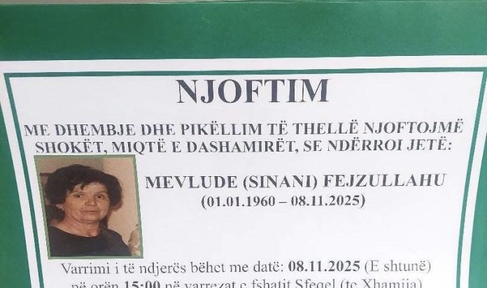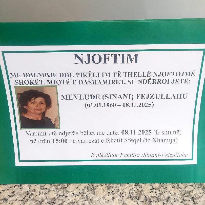 Ballina Lajmet Podujevë; Ndërron jetë Mevlude Sinani – Fejzullahu (Foto) Podujevë; Ndërron jetë Mevlude Sinani – Fejzullahu (Foto) 08/11/2025 Share FacebookTwitterWhatsAppViberEmail Ka ndërruar jetë Mevlude Sinani – Fejzullahu nga Podujeva. Varrimi i saj bëhet sot në ora 15:00 në varrezat e fshatit Sfeçël. Lajmi u bë i ditur nga familjarët e të ndjerës. ARTIKUJ TË NGJASHËMMË SHUMË NGA AUTORI Lajmet Nait Hasani i kërkon Bedri Hamzës ta pranoj shkrirjen e Fatmir Limajt në PDK: Bashkimi bën fuqi Lajmet Një person dhunon të miturën, e incizon dhe e publikon videon Lajmet Ky është personi që humbi jetën në QKUK, ishte i dyshuar për vrasje