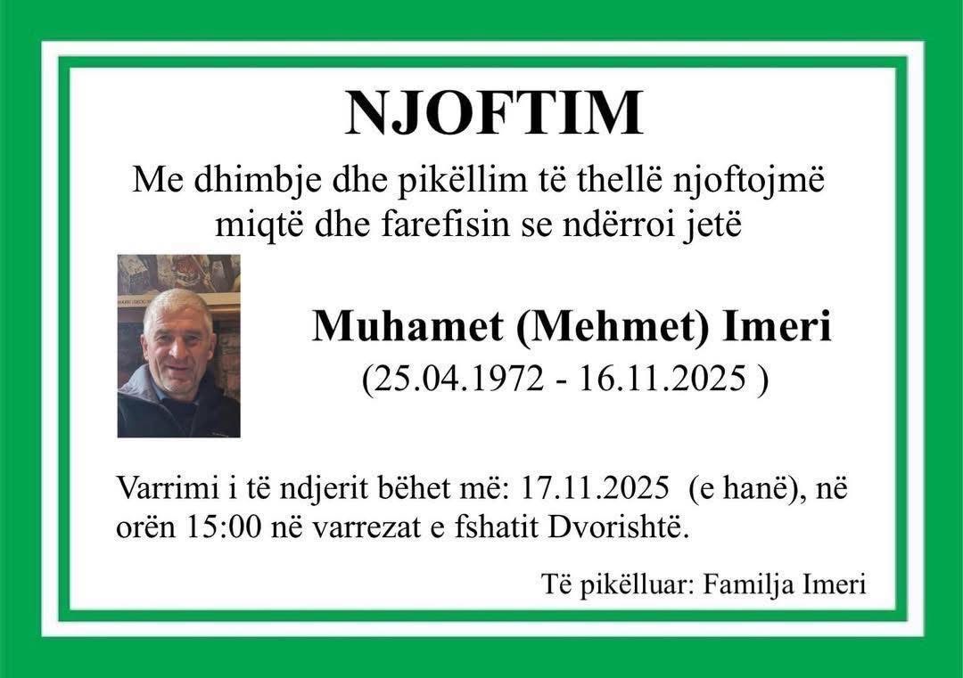 Ballina Lajmet Podujevë; Ndërron jetë Muhamet Imeri (Foto) Podujevë; Ndërron jetë Muhamet Imeri (Foto) 17/11/2025 Share FacebookTwitterWhatsAppViberEmail Ka ndërruar jetë Muhamet Imeri nga Podujeva. Varrimi i tij bëhet sot në ora 15:00 në varrezat e fshatit Dvorishtë. Lajmi u bë i ditur nga familjarët e të ndjerit. ARTIKUJ TË NGJASHËMMË SHUMË NGA AUTORI Lajmet Këta janë ministrat e prezantuar nga Glauk Konjufca Lajmet Dy seancat e sotme, Limaj i quan lojë të pushtetit dhe tendencë për t’i fajësuar të tjerët Lajmet Befason Isa Mustafa: Ramush Haradinajt duhet të ja di për nder krejt Kosova