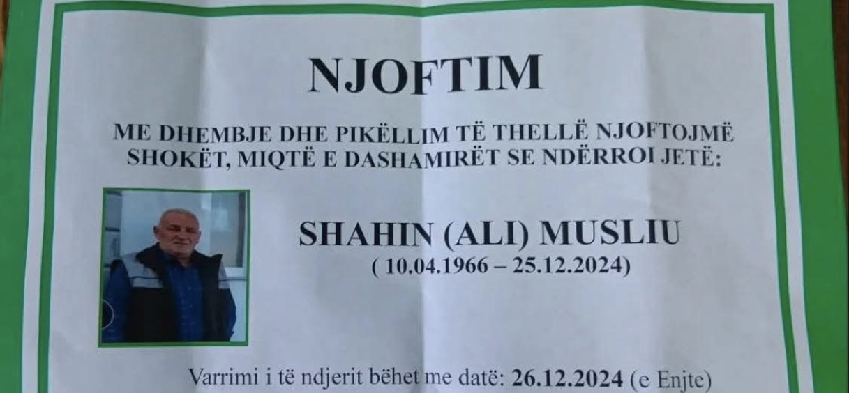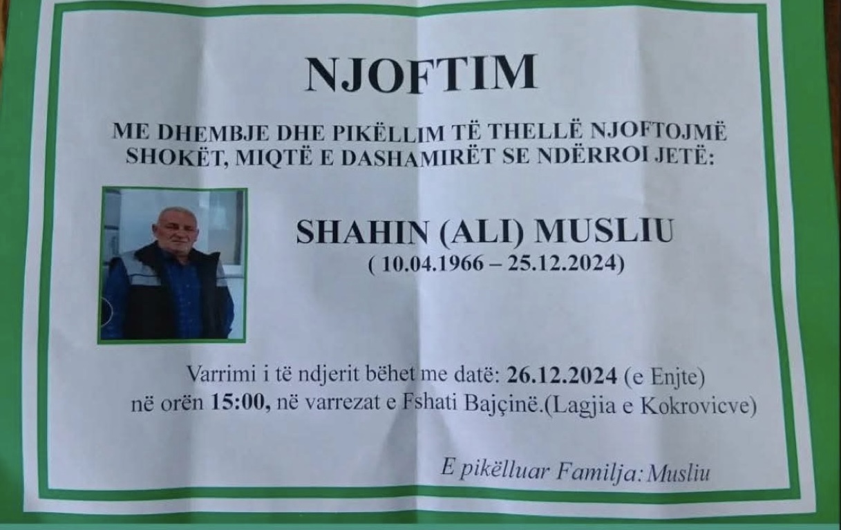 Ballina Lajmet Podujevë; Ndërron jetë Shahin Musliu (Foto) Podujevë; Ndërron jetë Shahin Musliu (Foto) 26/12/2024 Share FacebookTwitterWhatsAppViberEmail Ka ndërruar jetë Shahin Musliu nga Podujeva. Varrimi i tij bëhet sot në ora 15:00, në varrezat e fshatit Bajçinë. Lajmi u bë i ditur nga familjarët e të ndjerit. ARTIKUJ TË NGJASHËMMË SHUMË NGA AUTORI Lajmet Gruaja që u gjet e vdekur në lumin Bistrica ishte shtatzënë Lajmet Lista zgjedhore e PDK-së nis me Hamzën e përfundon me Tahirin, kaq kandidatë do të jenë Lajmet Dhjetështja e parë e LDK’së për zgjedhjet e 28 dhjetorit