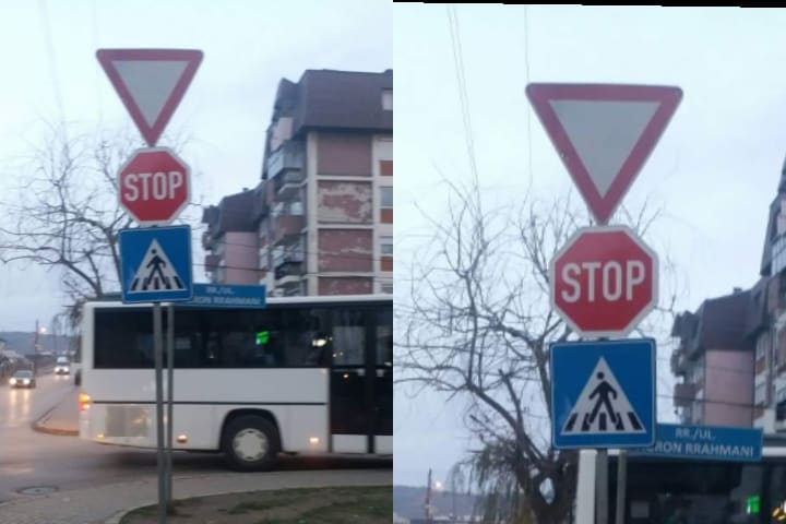 Një rast i tillë ka ndodhur në qytetin e Podujevës. Në kryqëzimin e rrugëve te Spitali, janë të vendosura dy shenja krejt të kundërta. Një thotë të vazhdohet lëvizja me kujdes të shtuar (trekëndësh), e tjetra si ndalje e obliguar (stop). Me këtë nuk mund të nënkuptohet edhe vazhdimi i lëvizjes dhe ndalja e obligueshme.