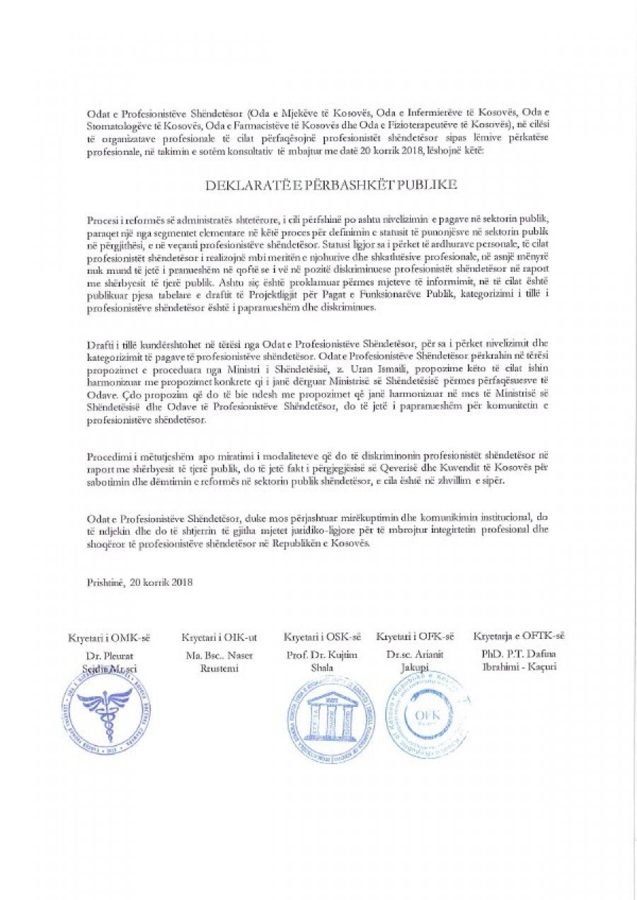 Në dokumentin dërguar mediave, kryetarët e odave të mjekëve, infermierëve, farmacistëve dhe fizioterapistëve kanë thënë se “çdo propozim që bie ndesh me propozimet e harmonizuara mes Ministrisë së Shëndetësisë dhe Odave të Profesionistëve Shëndetësorë do të jetë i papranueshëm për komunitetin e profesionistëve shëndetësorë”.