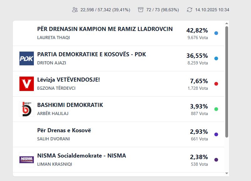 Sipas rezultateve të KQZ, për asamble komunale Lladrovci ka 42.82% të votave, ndërsa Hajdari ka 36.55%.