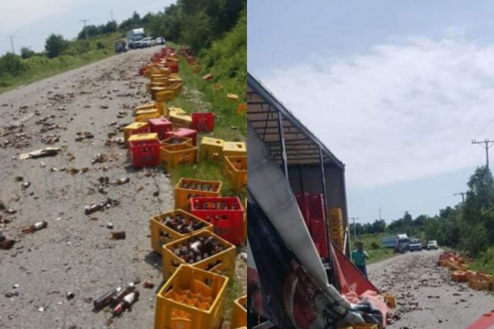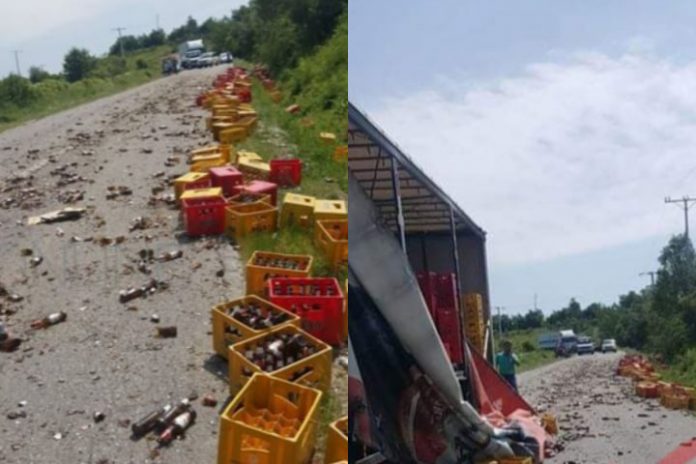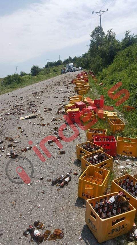 Dëmtimi i pjesës mbrojtëse të maunës ka bërë që pakot e qelqit të Birrës Peja të bien në rrugë duke bllokuar për disa minuta këtë aks rrugor.