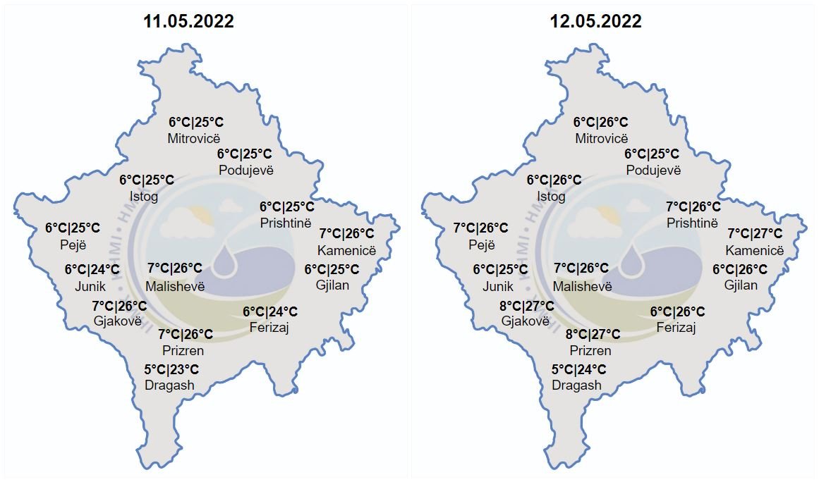 “Temperaturat minimale do të lëvizin ndërmjet 5-8 gradë Celsius, ndërsa maksimalet e ditës parashihen të lëvizin ndërmjet 23-27 gradë Celsius. Indeksi UV mbetet i lartë. Do të fryjë erë nga drejtimi i verilindjes dhe veriperëndimit me shpejtësi 1-6 m/s.”