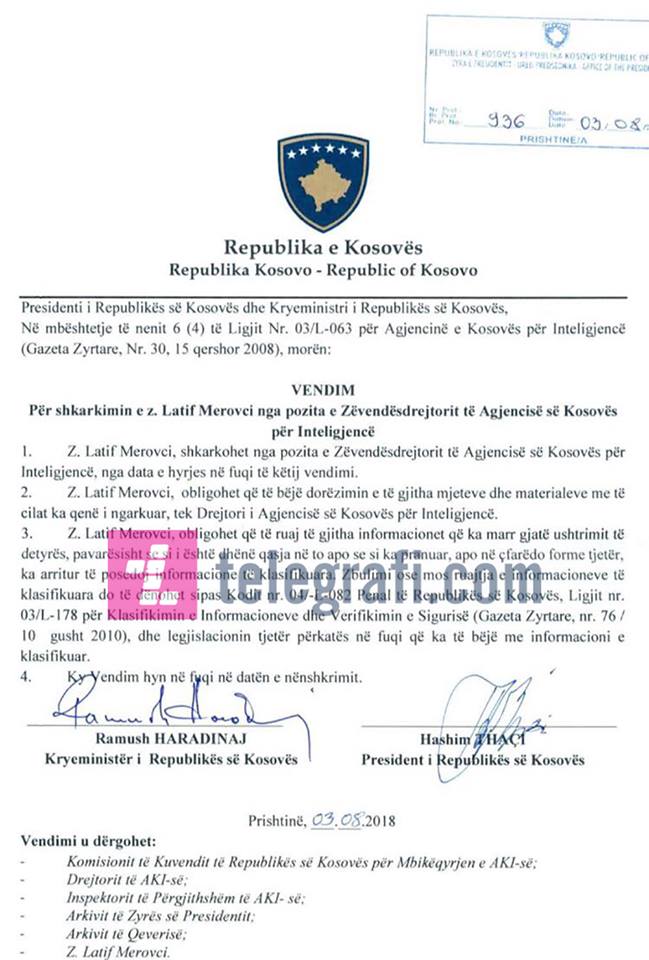 Presidenti i Republikës së Kosovës, Hashim Thaçi, si dhe kryeministri i Kosovës, Ramush Haradinaj, kanë marrë vendim për shkarkimin e Latif Merovcit nga pozita e zëvendësdrejtorit të Agjencisë Kosovës për Inteligjencë.