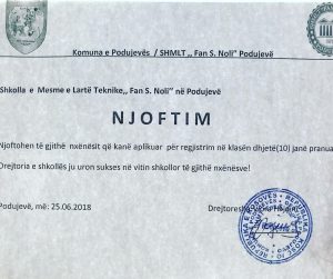 Shkolla e Mesme Teknike “Fan S. Noli” në Podujevë është duke pranuar ç’do nxënës i cili është duke aplikuar për t’u regjistruar në klasën e 10-të, shkruan Llapi.info.
