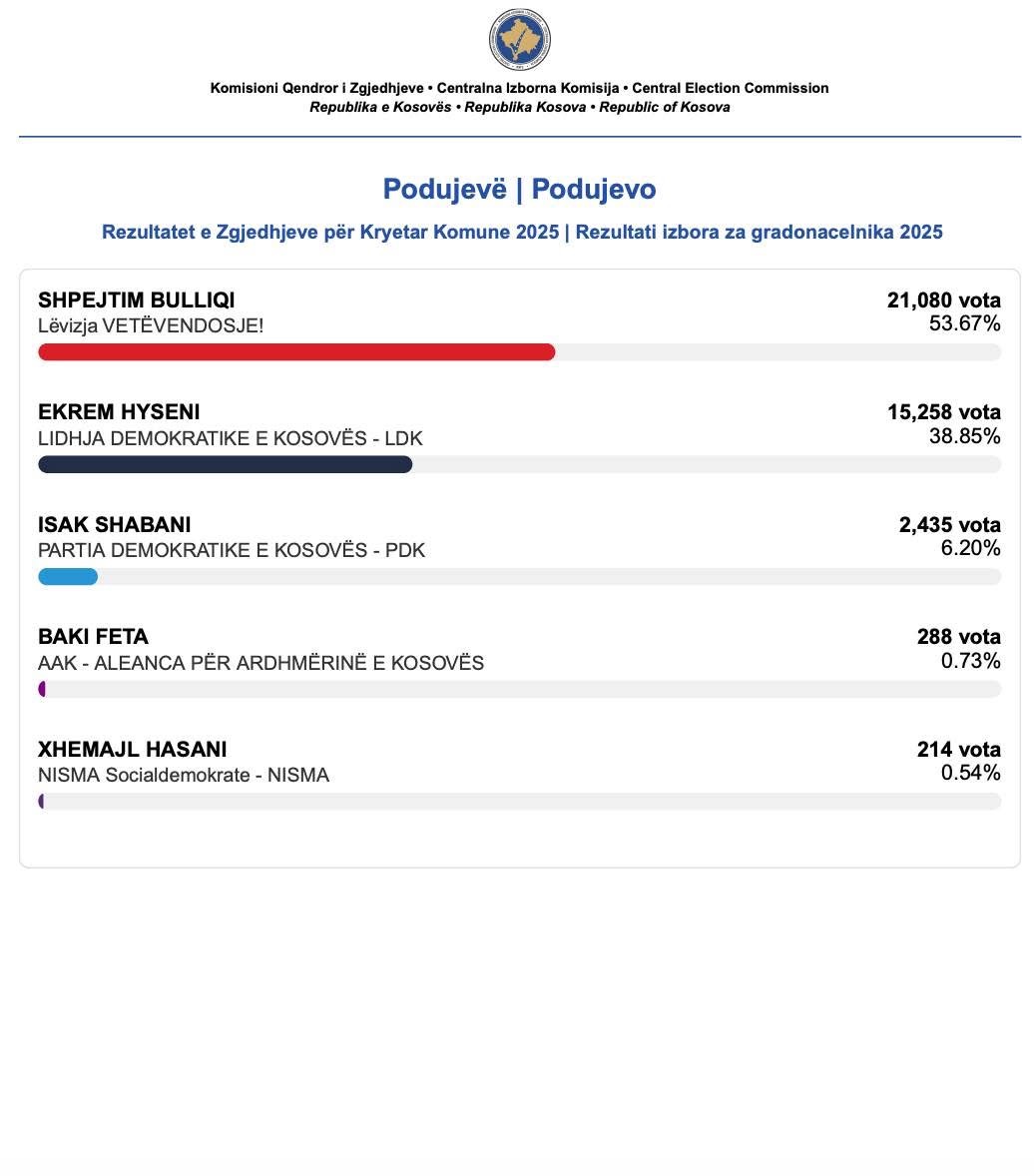 Ballina Lajmet Shpallen zgjedhjet përfundimtare në Podujevë – Ky është rezultati Shpallen zgjedhjet përfundimtare në Podujevë – Ky është rezultati 03/11/2025 Share FacebookTwitterWhatsAppViberEmail Komisioni Qendror Zgjedhor i ka shpallur zgjedhjet përfundimtare në Komunën e Podujevës. Nga zgjedhjet e 12 tetorit, ky është rezultati përfundimtar për të gjitha partitë politike. ARTIKUJ TË NGJASHËMMË SHUMË NGA AUTORI Lajmet Gruaja që u gjet e vdekur në lumin Bistrica ishte shtatzënë Lajmet Lista zgjedhore e PDK-së nis me Hamzën e përfundon me Tahirin, kaq kandidatë do të jenë Lajmet Dhjetështja e parë e LDK’së për zgjedhjet e 28 dhjetorit