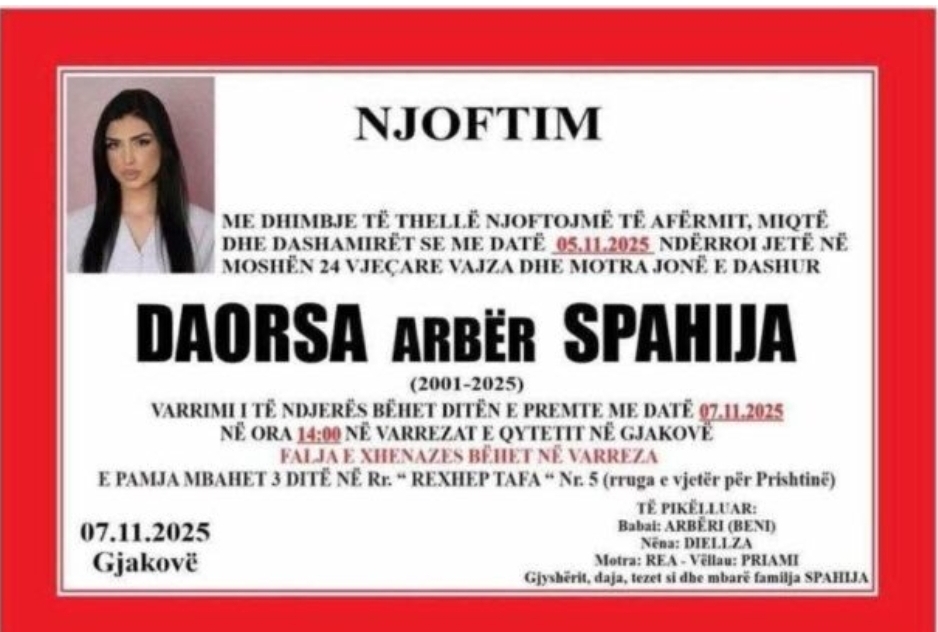 Sot varroset Daorsa Spahija, 25-vjeçarja nga Gjakova që vdiq mbrëmë në Tetovë të Maqedonisë së Veriut.