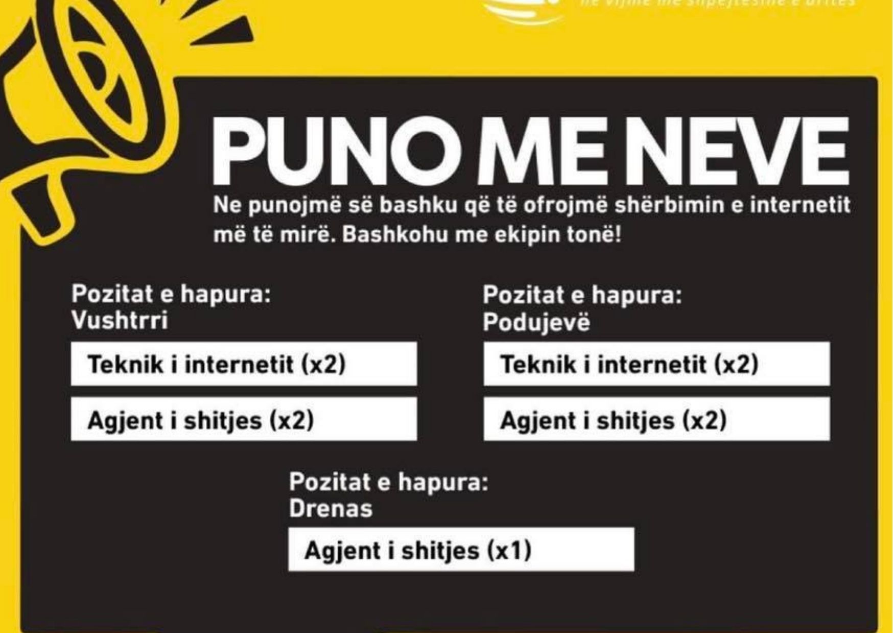 Dy konkurse të lira janë si agjent i shitjesTELKOS – Podujevë dhe dy të tjerë në pozitat: teknik i internetit.