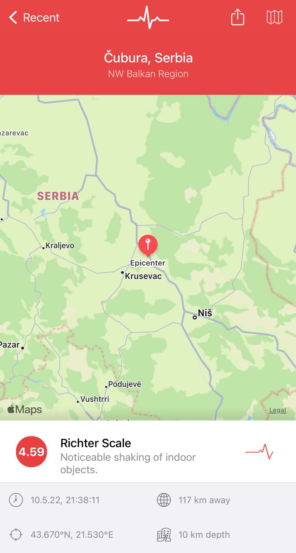 Ballina Lajmet Tërmet në Serbi afër Nishit Tërmet në Serbi afër Nishit 10/05/2022 Share FacebookTwitterWhatsAppViberEmail Një tërmet 4.59 shkallë Rihter ka goditur qytetin e Kragujevcit, afër Nishit. Deri më tani nuk ka raportime për dëme apo të lënduar. Dridhjet e tokës janë ndjerë disa minuta më parë. ARTIKUJ TË NGJASHËMMË SHUMË NGA AUTORI Lajmet Bajraktari i shkruan letër Trumpi: Angazhohuni që Specialja t’i gjykojë drejt ish-krerët e UÇK-së Lajmet Pa videon e gruas duke u puthur me tjetrin, 40-vjeçari vret fëmijët e tij dhe më pas vetëvritet Lajmet Zyrtarët e lartë amerikanë për gjykimin në Hagë: Procesi i stërzgjatur