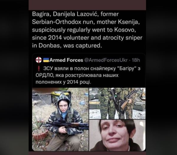 Në një postim të forcave ukrainase në Twitter, thuhet se Lazoviq, e cila rregullisht ka shkuar në Kosovë, që nga vitit 2014 (koha e nisjes së pushtimit të Donbasit nga Rusia) është angazhuar si snajperiste atje.