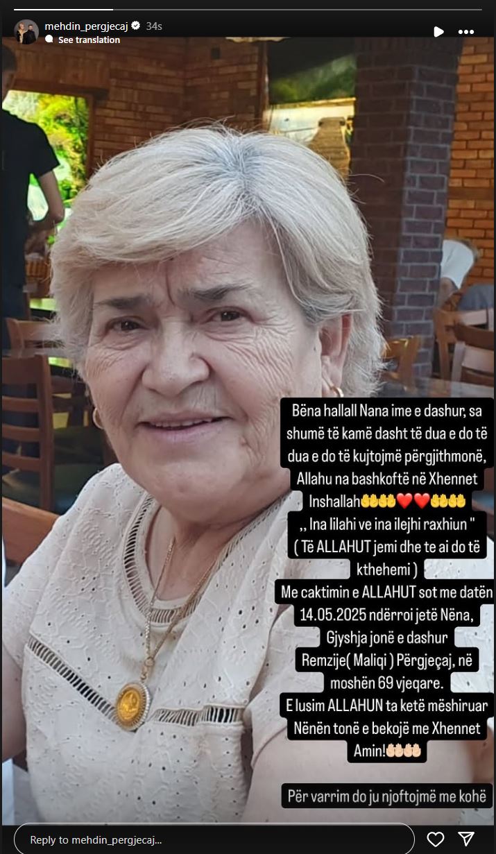 Një lajm i dhimbshëm ka tronditur sot familjen Përgjegjaj. Nëna e këngëtarit të njohur të muzikës popullore Meda, zonja Remzije (Maliqi) Përgjegjaj, është ndarë nga jeta më 14 maj 2025, në moshën 69-vjeçare.