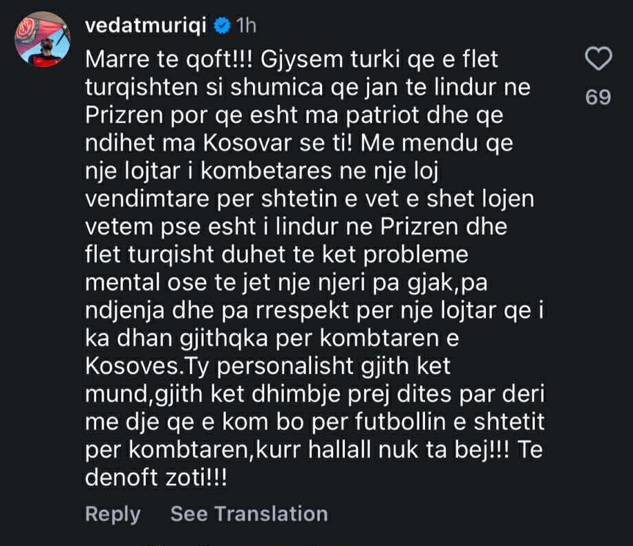 “Marre të qoft. Me mendu që një lojtar i Kombëtares, në një lojë vendimtare për shtetin e vet, e shet ndeshjen vetëm pse është i lindur në Prizren dhe flet turqisht, duhet të ketë probleme mentale ose të jetë një njeri pa ndjenja dhe pa respekt për një lojtar që ka dhënë gjithçka për Kosovën”, ka shkruar Muriqi.