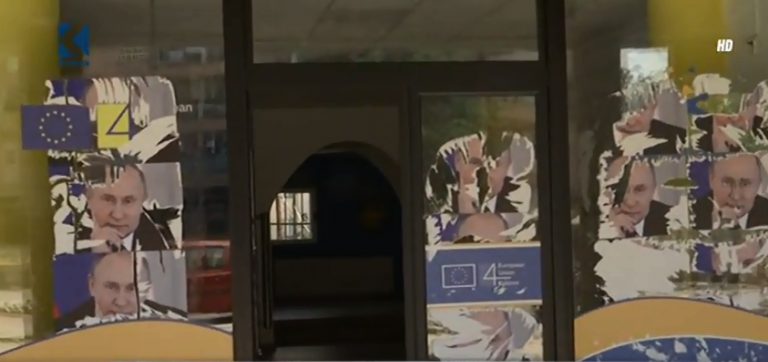 Më së shumti imazhe të Putinit janë parë në vitrinat e zyrës së Bashkimit Evropian e cila u hap të hënën.