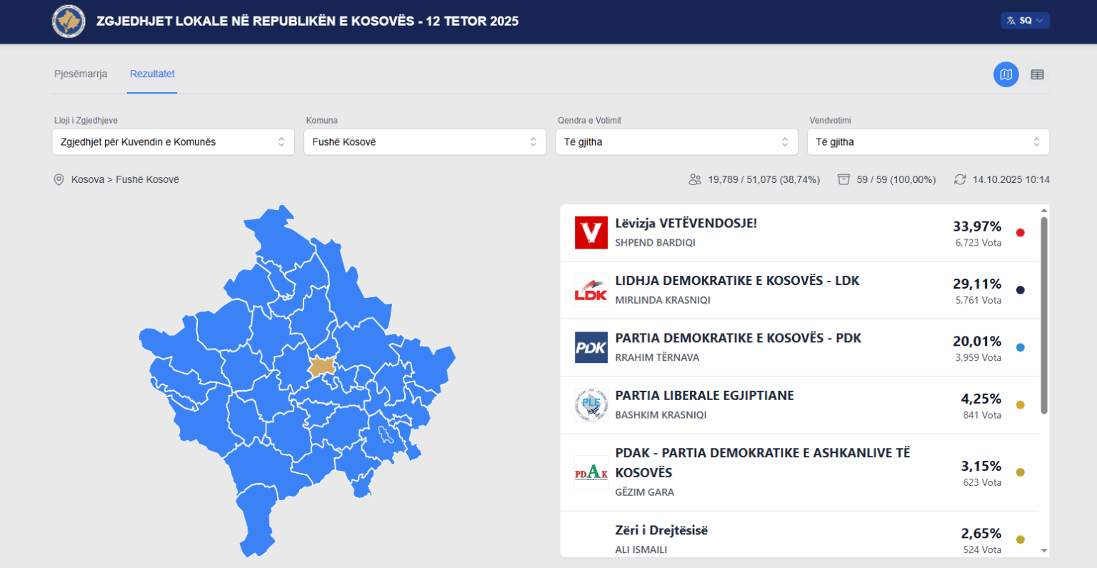 Sipas rezultateve zyrtare preliminare, Lëvizja Vetëvendosje ka dalë fituese në këtë komunë me 33.97% të votave (6,723 vota), duke lënë pas: